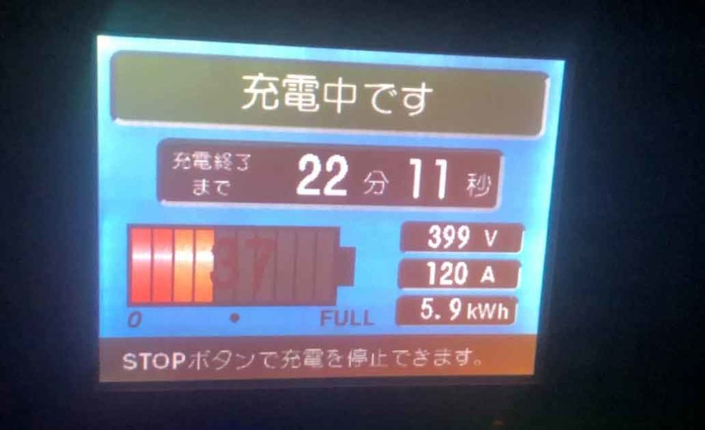 写真は急速充電器の表示ですが、399 Vで120 Aの電気が車に流れています。これは直流電流です。